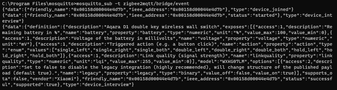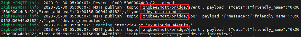 zigbee deivce가 테더링을 통해 GW에 등록되고 이를 z2m application에 등록하게되면 다음과 같은 topic, message가 발행된다.